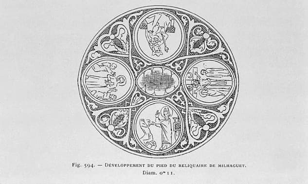 Développement du pied du reliquaire de Milhaguet (diam. 0 m 11). Quatre médaillons circulaires séparés par des rinceaux, de gauche à droite : saint Etienne de Muret, auréolé, debout un livre appuyé sur la poitrine, invoqué par deux moines agenouillés ; la 'messe de sainte Valérie' : sainte Valérie agenouillée présente sa tête décapitée à saint Martial mitré et auréolé, devant un autel ; le Calvaire ; la Vierge à l'enfant, couronnée et tenant un sceptre, trônant.