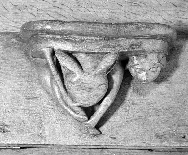 Détail des stalles basses côté nord-ouest, miséricorde n° 17 (stalle ouest) : lapin jouant de la cornemuse, flanqué à droite d'une petite tête.