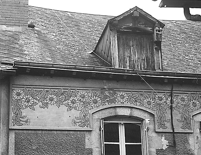La Souterraine, ville. 11 rue des Toiles. Maison. Vue partielle de l'élévation sur rue montrant le deuxième étage carré orné d'une frise peinte de style des années 30. Vue de détail de la frise représentant une décor floral. Cadastre 1992 BD 43.