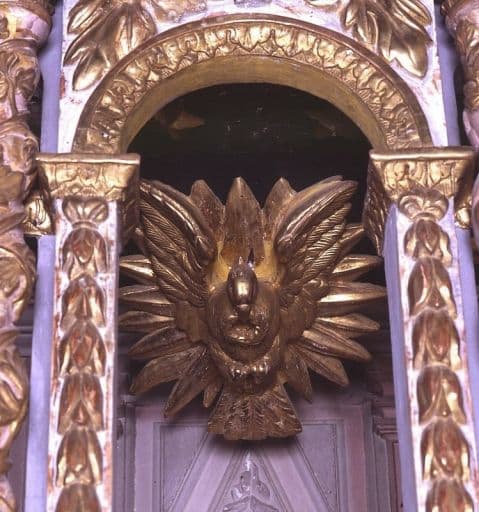Détail de la colombe du Saint-Esprit dans la niche centrale du tabernacle.