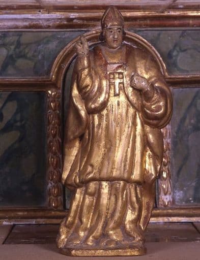 Détail de la statuette de saint évêque bénissant, face.