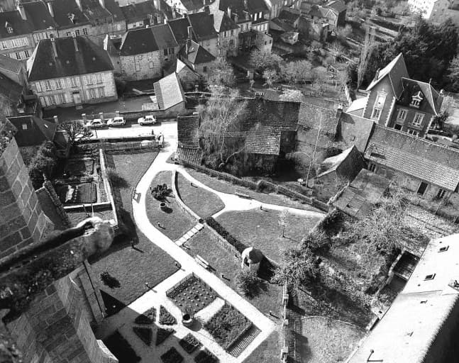 Vue depuis le clocher de l'église du Moutier montrant le site de l'ancien cloître au sud de l'église.