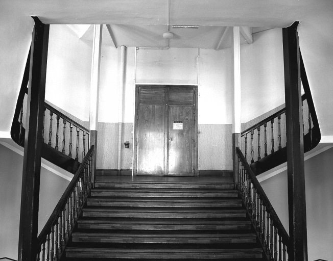 Les escaliers distribuant les ateliers des ailes nord et sud : vue prise depuis le repos, en direction du palier du 1er étage.