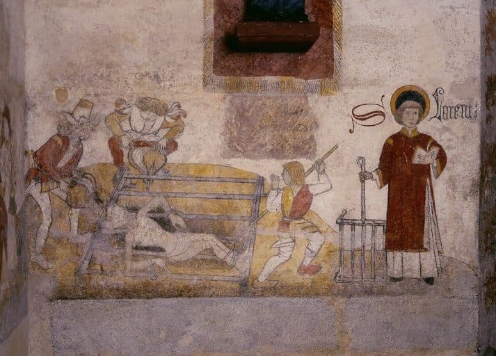 Martyre de saint Laurent. Détail de la scène représentant de gauche à droite le martyre sur le gril et saint Laurent en pied avec ses attributs.