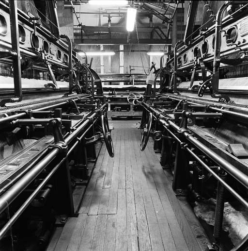 Vue d'ensemble ouest de l'atelier des métiers ; Vue générale des métiers à tisser la dentelle, atelier de Villeurbanne