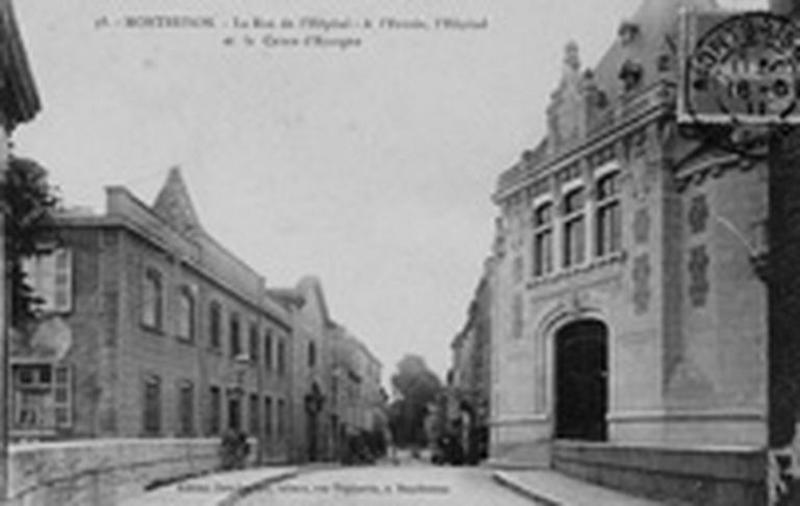 MONTBRISON. - La rue de l'Hôpital - A l'entrée, l'Hôpital et la Caisse d'Epargne. Carte postale [tampon 1911].