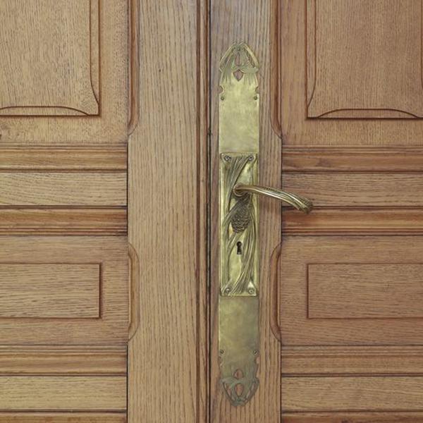 Salle du conseil : ornementation végétale d'une poignée de porte et d'une entrée de serrure en plaque.