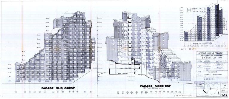 Permis de construire modificatif. Elévations sud-ouest et nord-est ; schéma de répartition des appartements / J. Labro, J. J. Orzoni, bureau d'études Decaen, février 1988 (AC Morzine)