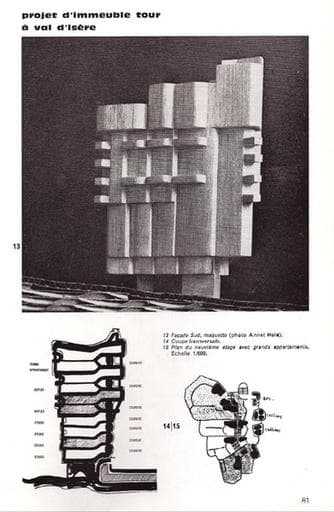 Maquette d'un projet non réalisé pour Val d'Isère, rappelant les immeubles tours en pyramide inversée des Essaveaux, 1968-1969. In : <<I>>Recherche et Architecture>>, n° 2, 1970
