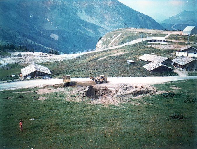 1970, aménagement de l'altiport sur le rebord de la falaise (en arrière plan, les chalets d'alpage)
