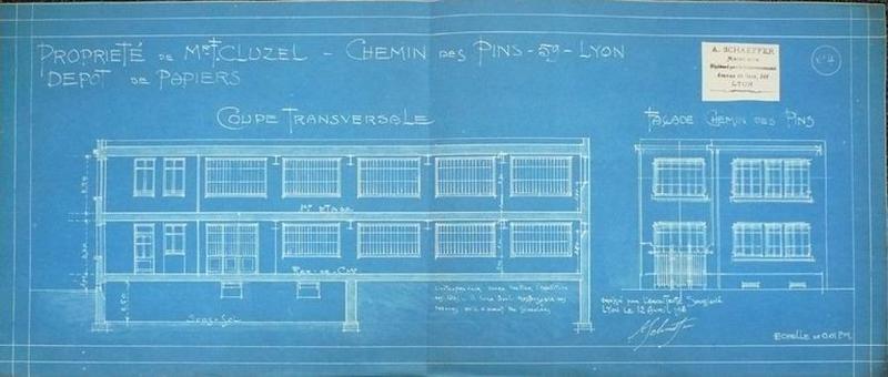 AC Lyon : sans cote, coupe transversale et façade sur rue d'une usine pour monsieur Cluzel par monsieur Schaeffer.