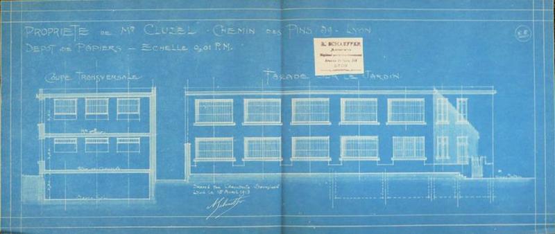 AC Lyon : sans cote, coupe transversale et façade sur le jardin de l'usine de monsieur Cluzel par monsieur Schaeffer.