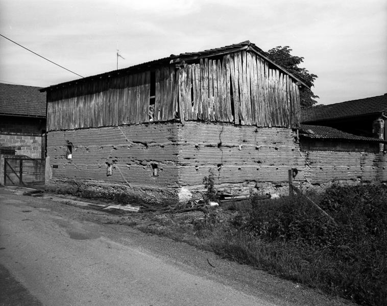 Vue générale d'un séchoir sur étable en pisé et essentage de planches (Les Caires, Limons).