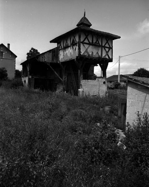 Vue générale d'un pigeonnier à pans de bois sur poteaux, avec base à demi clôturée (Vensat, Maringues).