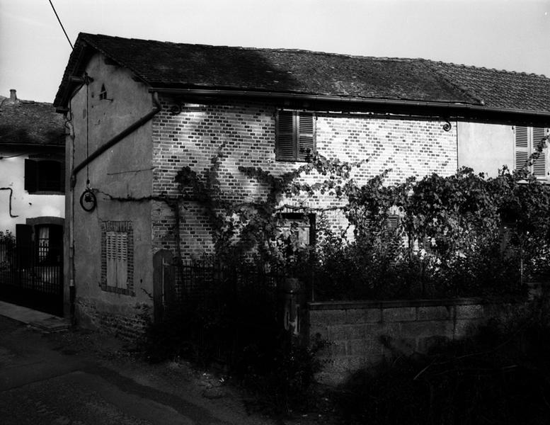 Vue générale d'un logis de ferme à élévation en briques polychormes (Luzillat, village)