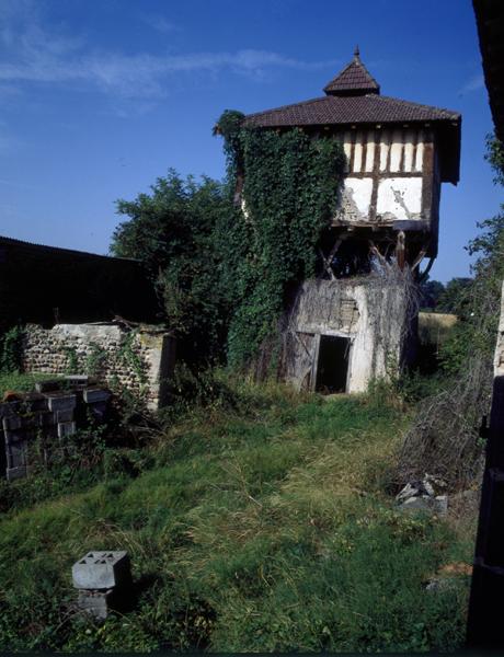Vue générale d'un pigeonnier à pans de bois sur poteaux, avec base clôturée (Les Garmins, Luzillat).