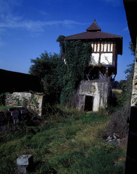 Vue générale d'un pigeonnier à pans de bois sur poteaux, avec base clôturée (Les Garmins, Luzillat).