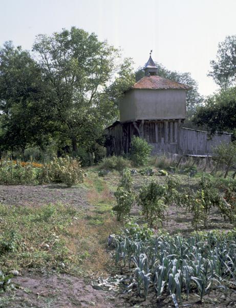 Vue générale d'un pigeonnier à pans de bois sur poteaux, avec base clôturée par un essentage de planches (Le Thuel, Maringues).