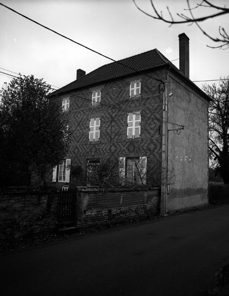 Vue générale d'un logis de ferme à élévation en briques polychromes (Demolles, Luzillat).