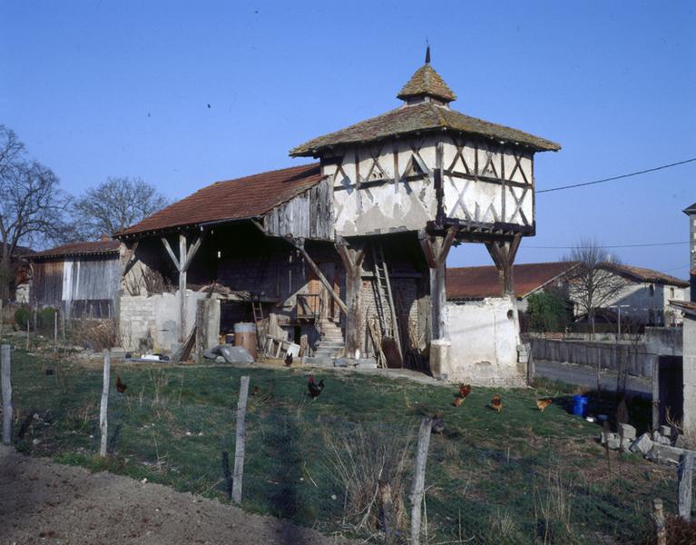 Vue générale d'un pigeonnier à pans de bois sur poteaux, avec base à demi clôturée (Vensat, Maringues).
