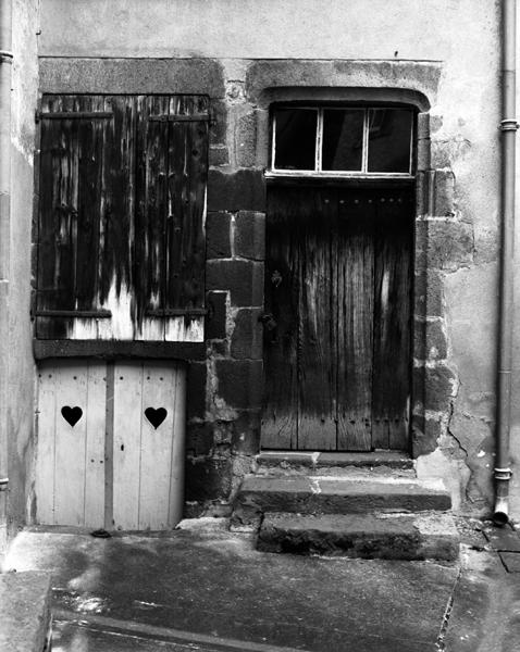 Détail d'une porte accolée à une fenêtre surmontant une entrée extérieure de cave (Maringues, ville).