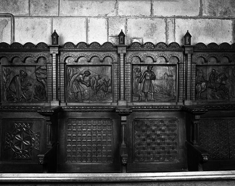 Détail du groupe de gauche,décor des dossiers : taille des arbres en février,semailles en mars
