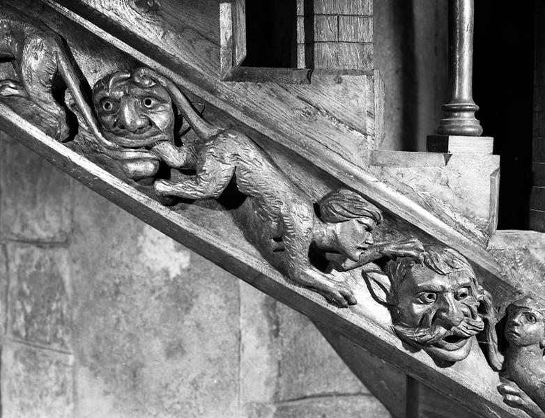 Détail du limon de l'escalier,hybride anthropomorphe et masques grotesques
