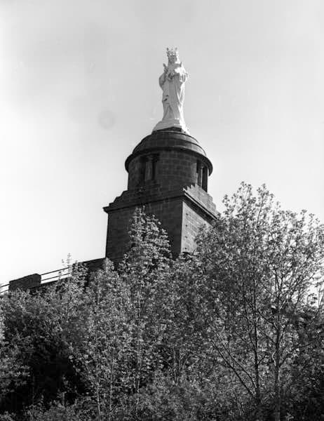 Vue de la façade ouest et de la Vierge à l'enfant en fonte qui remplace la statue primitive en pierre