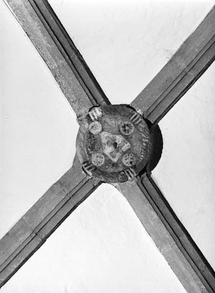 Vue de détail de la clé de voûte de la 3ème travée de la nef