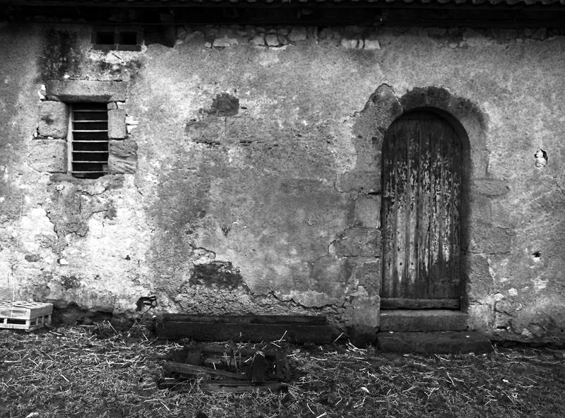 Logis ancien, façade nord. Vue de détail de la fenêtre d'origine et de la porte d'entrée repercée.