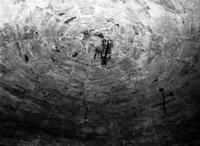 Voûte de la cave : vue de détail des crochets à viande médiévaux