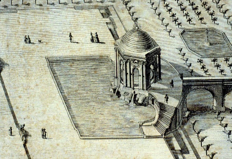 Gravure : bassin et place des eaux (vue cavalière)