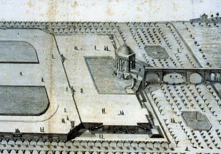 Gravure : bassin et place des eaux (vue cavalière)