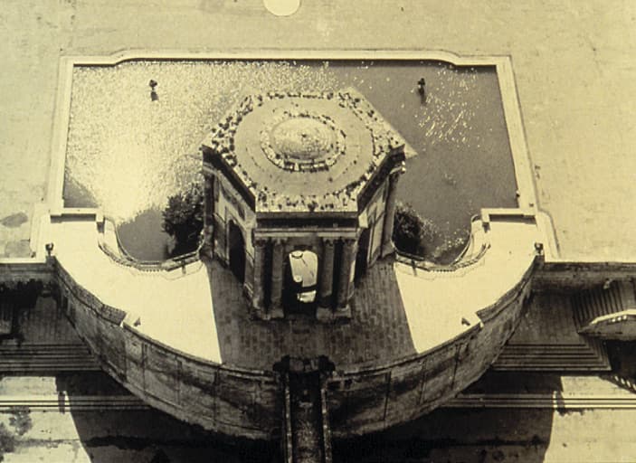 Vue aérienne du château d'eau en noir et blanc.