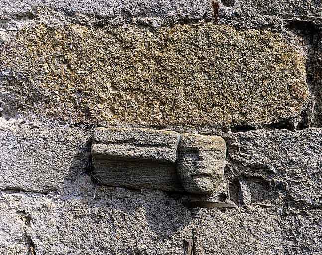 Tête sculptée en remploi dans l'élévation sud de la chapelle