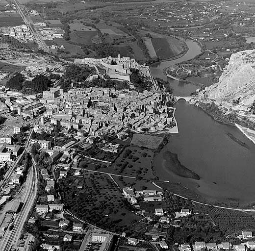 Vue générale du site, implantation de la ville au bord de la Durance.