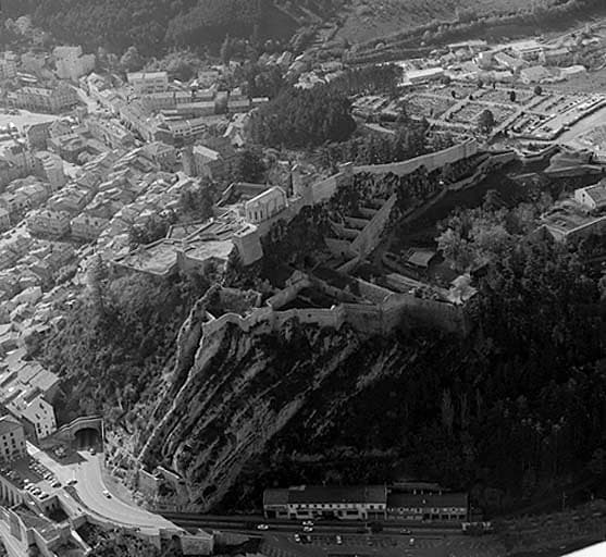 Vue aérienne nord/nord-est : l'arête rocheuse séparant les deux moitiés de la citadelle.