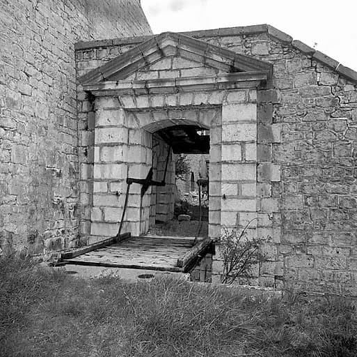Porte du donjon. Vue extérieure, pont-levis en zig-zag ou à parallélogramme en position ouverte.