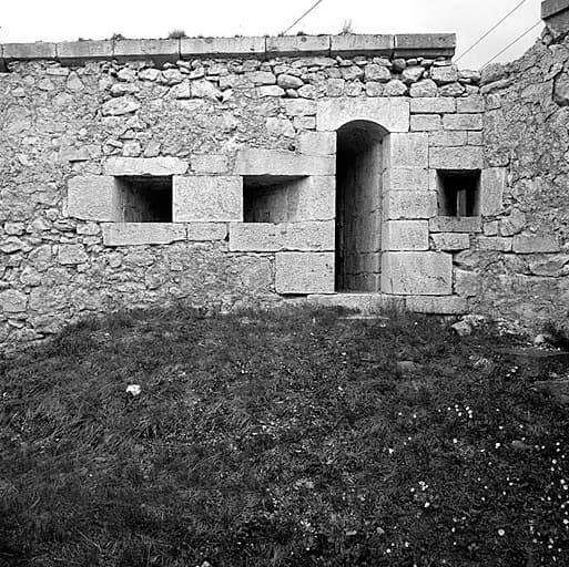 Donjon. Batterie supérieure. Parapet à gauche de la batterie Haxo. Encadrée de créneaux de mousquetterie, entrée du corridor d'accès à l'échauguette de gauche, avec rainures pour blindage.