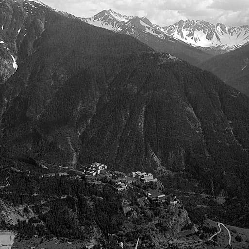 Vue lointaine du fort prise de la Croix de Toulouse. Derrière, la vallée de la Cerveyrette et sur la montagne, le fort de la Croix de Bretagne.