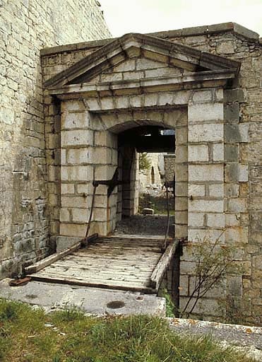 Porte du donjon. Vue extérieure, pont-levis en zig-zag ou à parallélogramme en position ouverte.