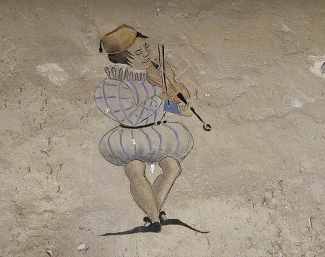 Caserne, chambre de troupe du rez-de-chaussée. Peinture murale : musicien en habit Renaissance.