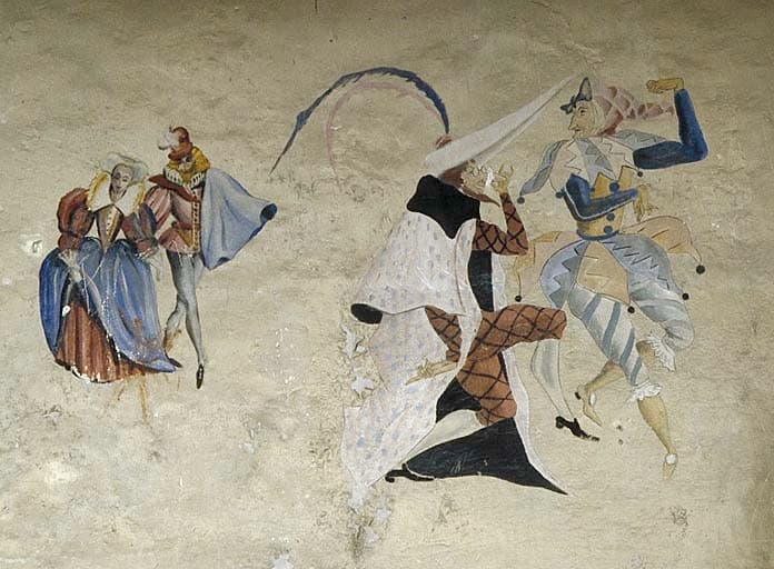 Caserne, chambre de troupe du rez-de-chaussée. Peinture murale : danseurs en habits Renaissance.