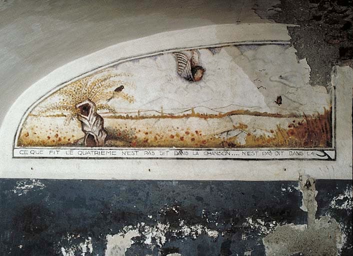 Caserne, chambre de troupe du rez-de-chaussée. Peinture murale illustrant la chanson Jeanneton prend sa faucille : ce que fit le quatrième ...