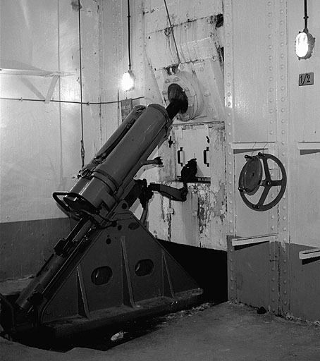 Ouvrage moderne. Bloc 2. Rez-de-chaussée. Mortier de 81 mm mle 32 de casemate (pièce de gauche) en place dans la chambre de tir (1/2). Vue arrière droite.