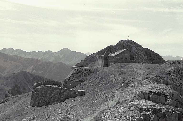 Dessus vus de l'est. En bas, à gauche, escarpe défensive. Au centre, le blockhaus avec, en arrière, le sommet de Château Jouan.