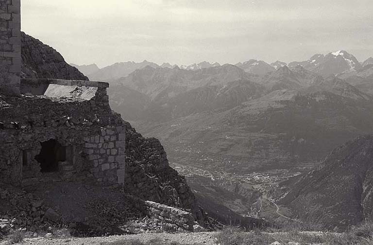 Face nord-est. Au premier plan, à gauche, bastionnet nord. Au centre et en contrebas, Briançon. A l'arrière plan, le massif des Ecrins.