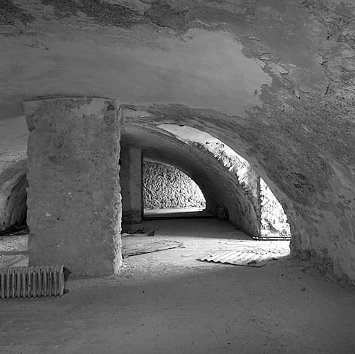 Caserne A. Premier étage. Local 4. Vue longitudinale. Au centre, massif des cheminées.