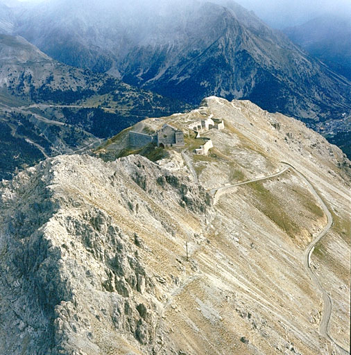 Vue aérienne prise du sud-ouest. Au premier plan, sommet de château Janus. Derrière à droite, blockhaus et blocs de l'ouvrage moderne.