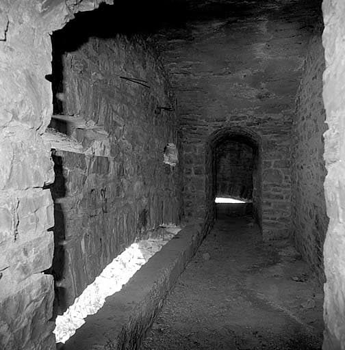 Aileron. Vue intérieure de la galerie d'accès. A gauche, en bas, créneau de pied surmonté de deux créneaux horizontaux.